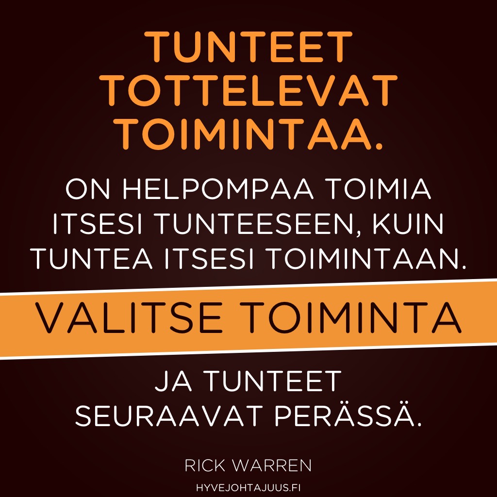 Tunteet tottelevat toimintaa. On helpompaa toimia itsesi tunteeseen, kuin tuntea itsesi toimintaan. Valitse toiminta ja tunteet seuraavat perässä.— Rick Warren