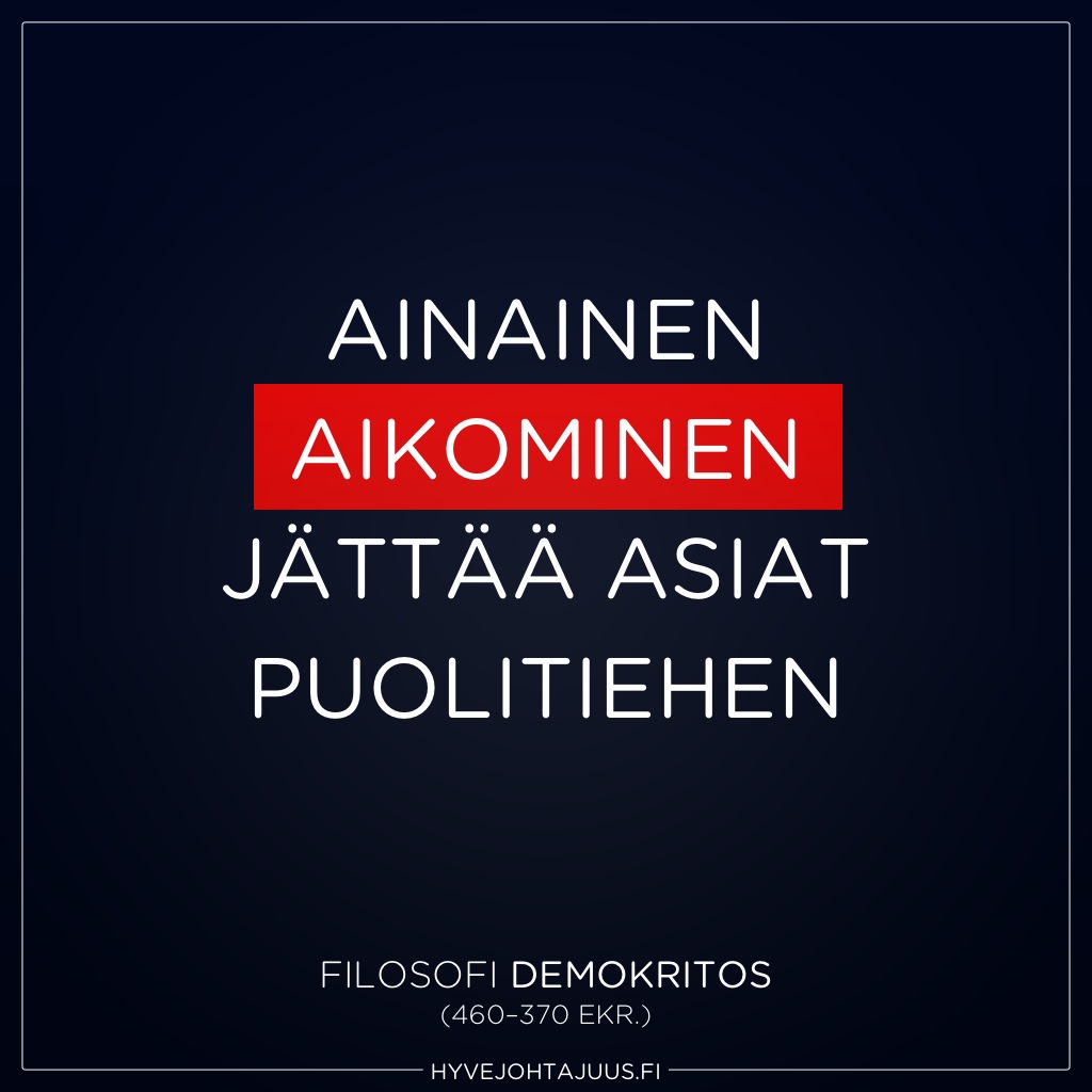 Päivän pääoma Ainainen aikominen… 20.2.2014 Päivän pääoma Ainainen aikominen jättää asiat puolitiehen.— Filosofi Demokritos (460–370 eKr.) Muita juttuja Päivän pääoma Paras aika… 15.5.20173.5.2017 Päivän pääoma Päivän pääoma Se, että emme uskalla… 8.5.20173.5.2017 Päivän pääoma