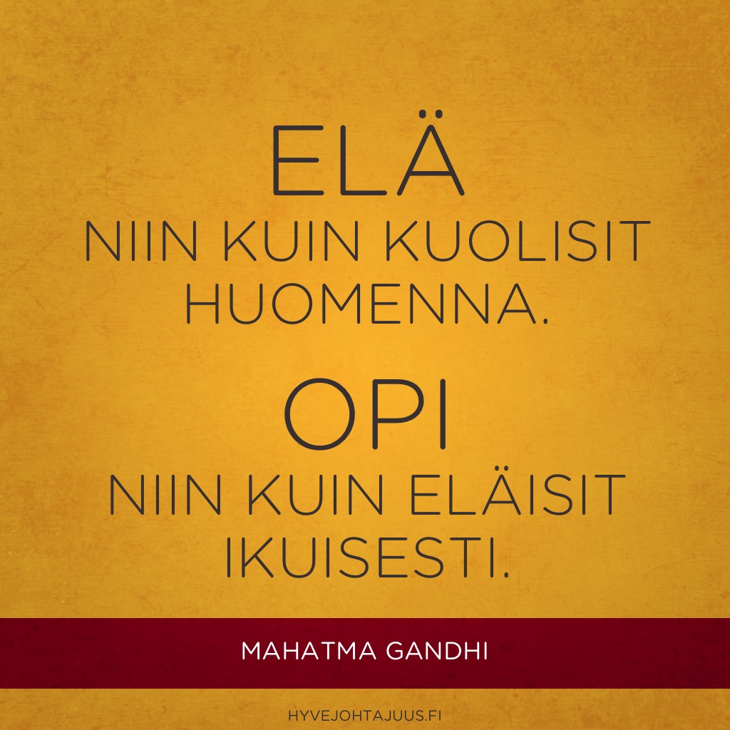 Päivän pääoma Elä niin kuin… 5.6.20142.6.2014 Päivän pääoma Elä niin kuin kuolisit huomenna. Opi niin kuin eläisit ikuisesti.— Mahatma Gandhi Muita juttuja Päivän pääoma Paras aika… 15.5.20173.5.2017 Päivän pääoma Päivän pääoma Se, että emme uskalla… 8.5.20173.5.2017 Päivän pääoma
