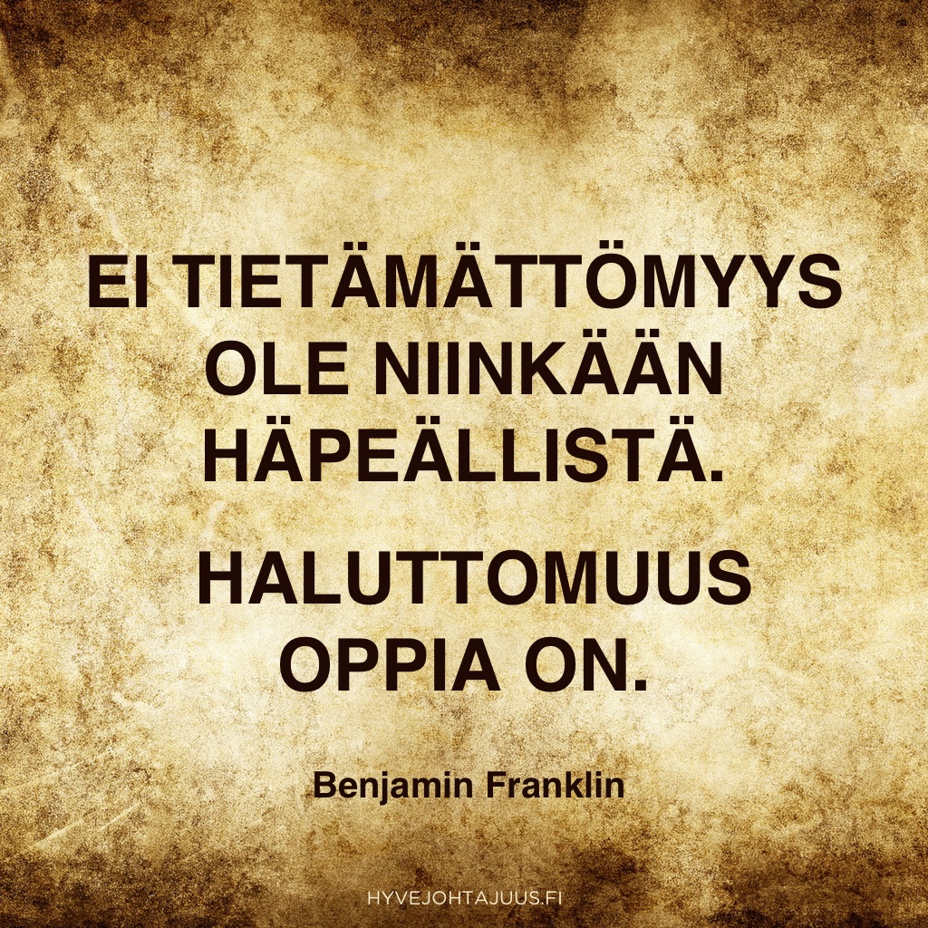 Päivän pääoma Ei tietämättömyys ole häpeällistä… 21.9.2015 Päivän pääoma Ei tietämättömyys ole niinkään häpeällistä. Haluttomuus oppia on.— Benjamin Franklin Muita juttuja Päivän pääoma Paras aika… 15.5.20173.5.2017 Päivän pääoma Päivän pääoma Se, että emme uskalla… 8.5.20173.5.2017 Päivän pääoma