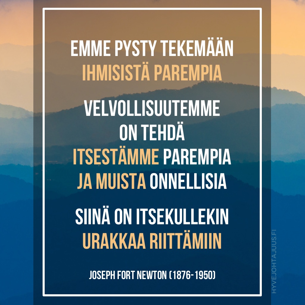 Emme pysty tekemään ihmisistä parempia. Velvollisuutemme on tehdä itsestämme parempia ja muista onnellisia. Siinä on itsekullekin urakkaa riittämiin.