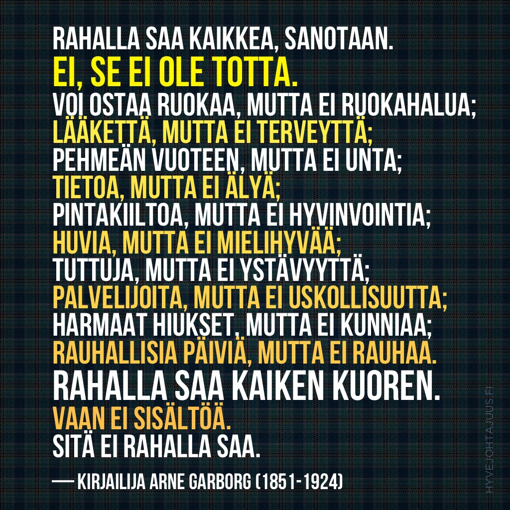 Rahalla saa kaikkea, sanotaan. Ei, se ei ole totta. Voi ostaa ruokaa, mutta ei ruokahalua; lääkettä, mutta ei terveyttä; pehmeän vuoteen, mutta ei unta; tietoa, mutta ei älyä; pintakiiltoa, mutta ei hyvinvointia; huvia, mutta ei mielihyvää; tuttuja, mutta ei ystävyyttä; palvelijoita, mutta ei uskollisuutta; harmaat hiukset, mutta ei kunniaa; rauhallisia päiviä, mutta ei rauhaa. Rahalla saa kaiken kuoren. Vaan ei sisältöä. Sitä ei rahalla saa.