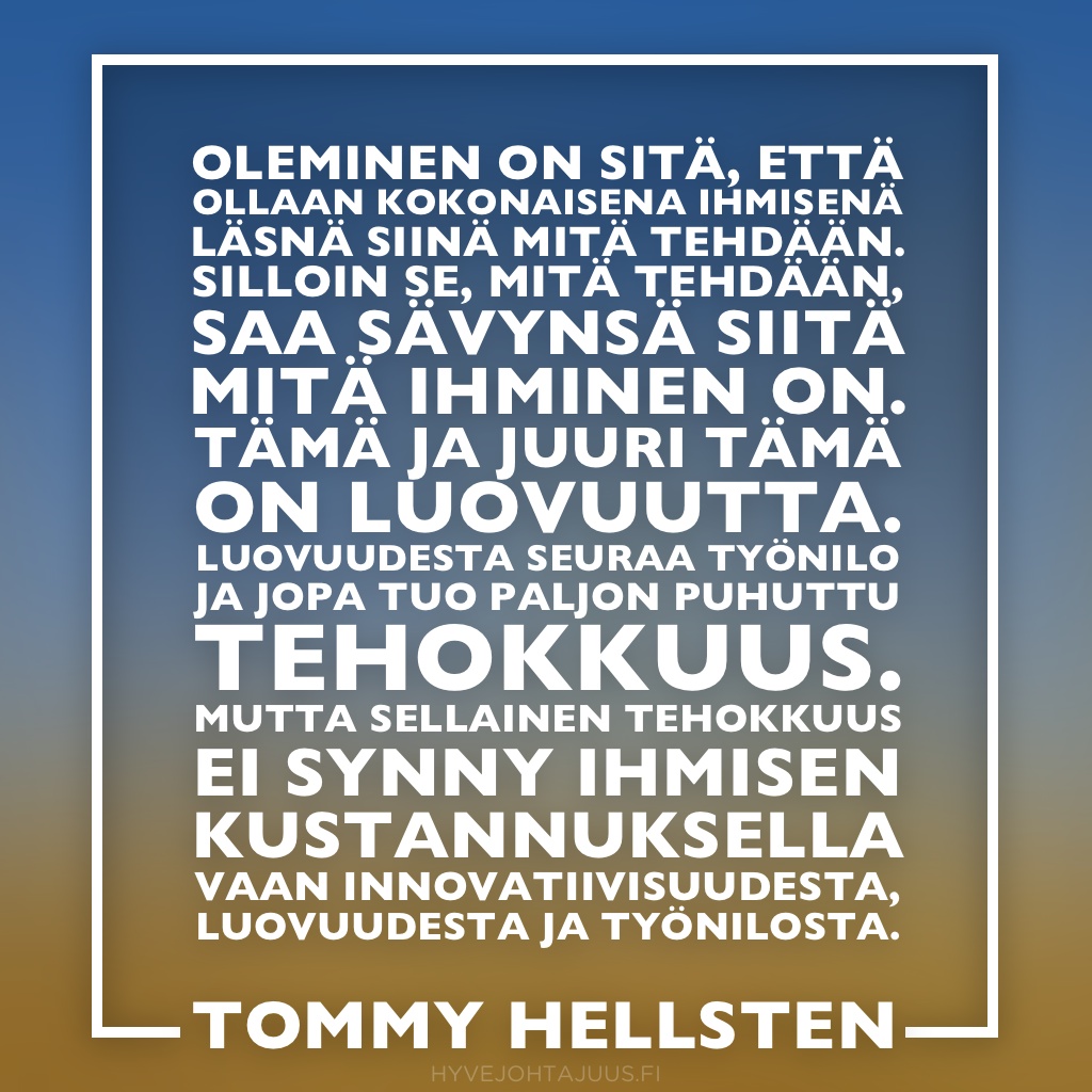 Oleminen on sitä, että ollaan kokonaisena ihmisenä läsnä siinä mitä tehdään. Silloin se, mitä tehdään, saa sävynsä siitä mitä ihminen on. Tämä ja juuri tämä on luovuutta. Luovuudesta seuraa työnilo ja jopa tuo paljon puhuttu tehokkuus. Mutta sellainen tehokkuus ei synny ihmisen kustannuksella vaan innovatiivisuudesta, luovuudesta ja työnilosta.