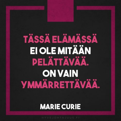 Päivän pääoma Tässä elämässä ei ole… 23.1.2017 Päivän pääoma Tässä elämässä ei ole mitään pelättävää. On vain ymmärrettävää.— Fyysikko Marie Curie (1867-1934) Muita juttuja Päivän pääoma Paras aika… 15.5.20173.5.2017 Päivän pääoma Päivän pääoma Se, että emme uskalla… 8.5.20173.5.2017 Päivän pääoma