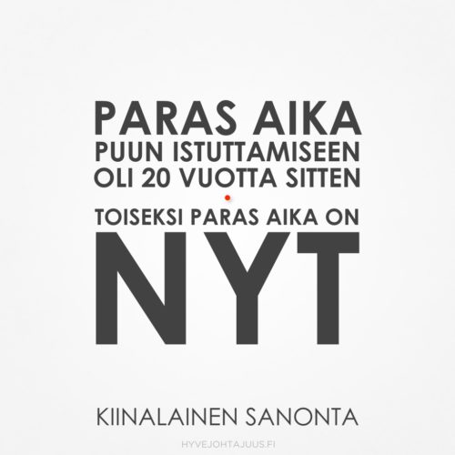 Paras aika puun istuttamiseen oli 20 vuotta sitten. Toiseksi paras aika on nyt.— Kiinalainen sanonta