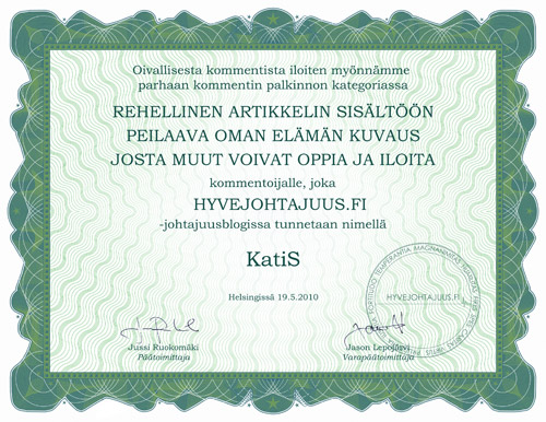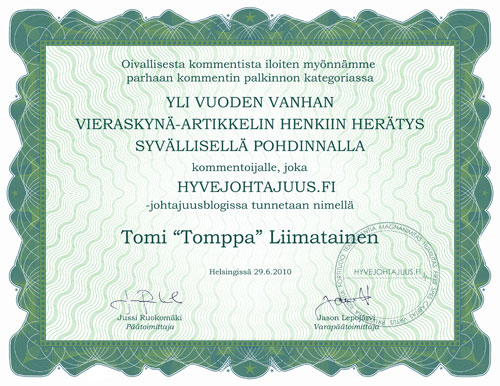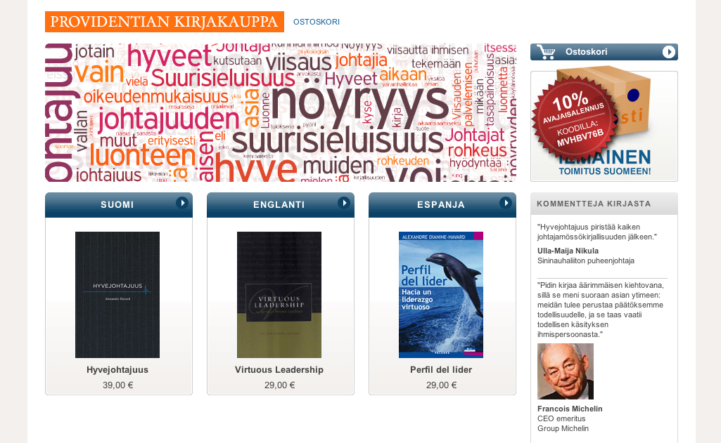 Joulutarjous Hyvejohtajuus (Providentia 2009) on nyt joulualennuksessa 34,90€ (norm. 39,00€), sis. postituksen kotiin! Tilaa vuoden paras joululahja täältä. Joulukilpailu Vai haluatko kirjan ilmaiseksi? Osallistumalla Facebook-arvontaan